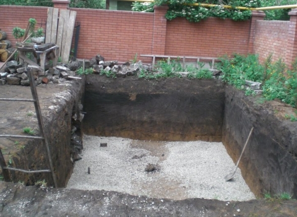 Когда наша чаша будет готова займемся ее гидроизоляцией и снаружи и внутри. Наружная изоляция необходима для защиты чаши от грунтовых вод, а внутренняя чтобы вода из чаши не уходила. Для наружной изоляции выполняем следующие действия: делаем обмазку битумной мастикой, а поверх нее наклеиваем два слоя рубероида. Причем первый слой делаем по горизонту, а второй по вертикали и внахлест.