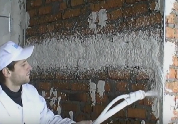 - С помощью пистолета горизонтально наносить на поверхность слой штукатурки (не более 3-4 см);