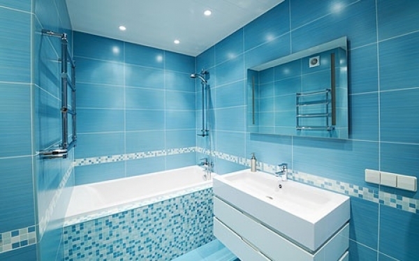 Для окраски стен, необходимо использовать как минимум три тона синей краски, во избежание сливания стены с потолком. Рекомендуется использование серебристых и серых тонов, так как они хорошо гармонируют со всеми оттенками выбранного нами цвета. Света в ванной должно быть много, поэтому лучше установить несколько лишних светильников или более ярких осветительных приборов. Пол должен быть светлее стен.